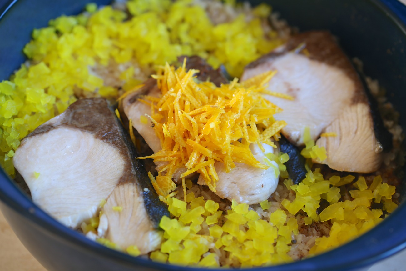 7、10分の蒸らしが終わったら、たくあん、ゆず皮を散らす。