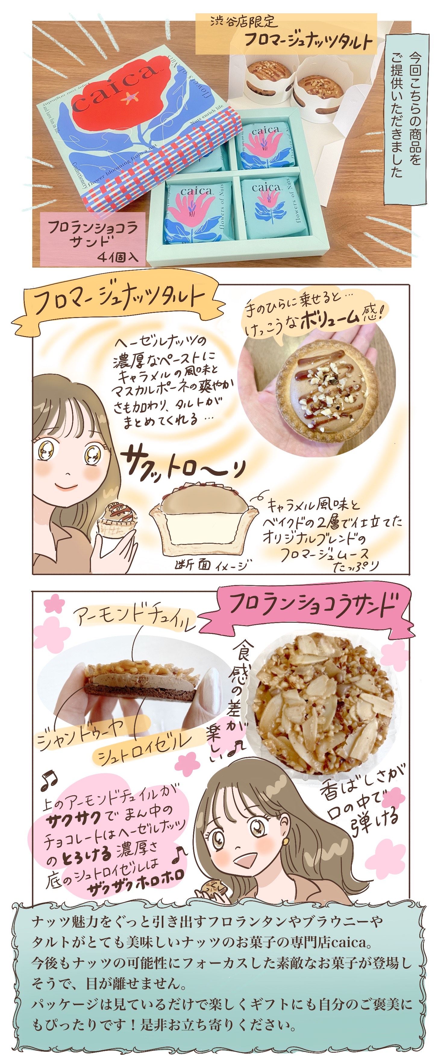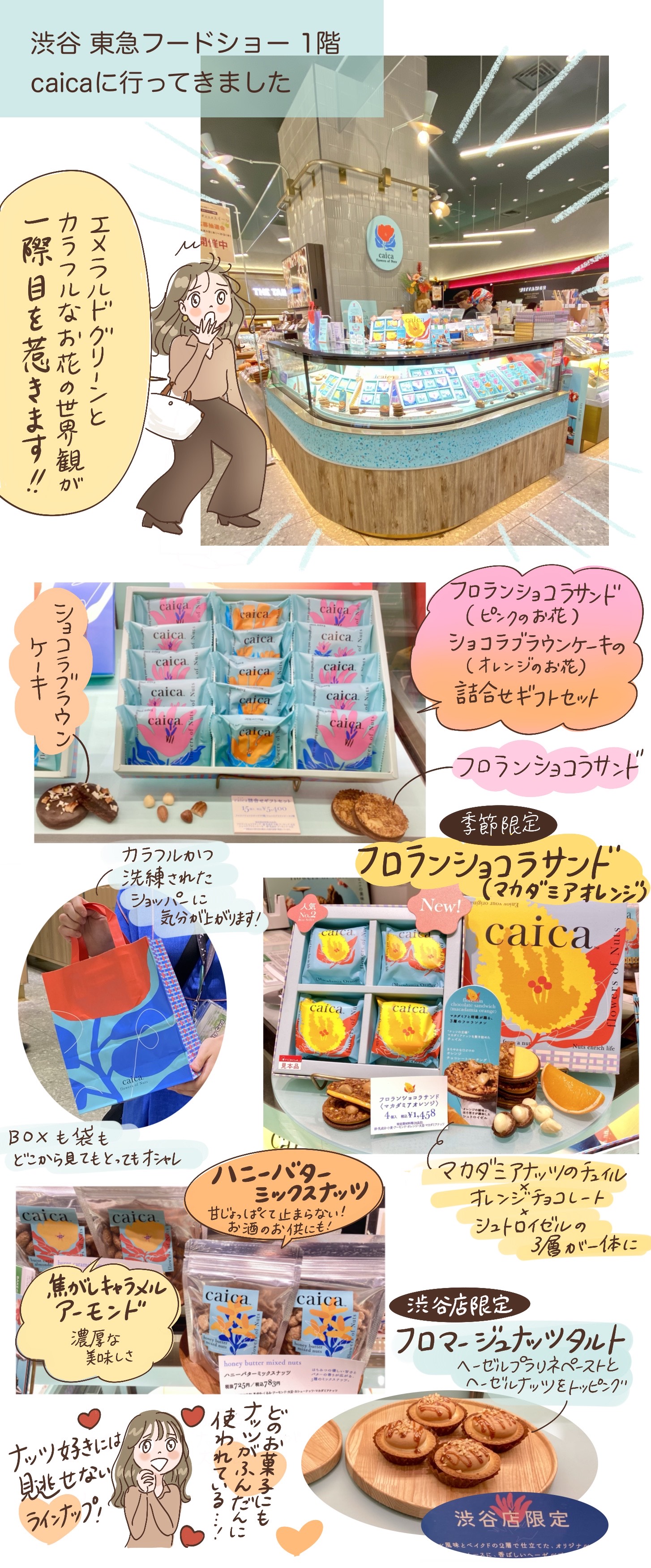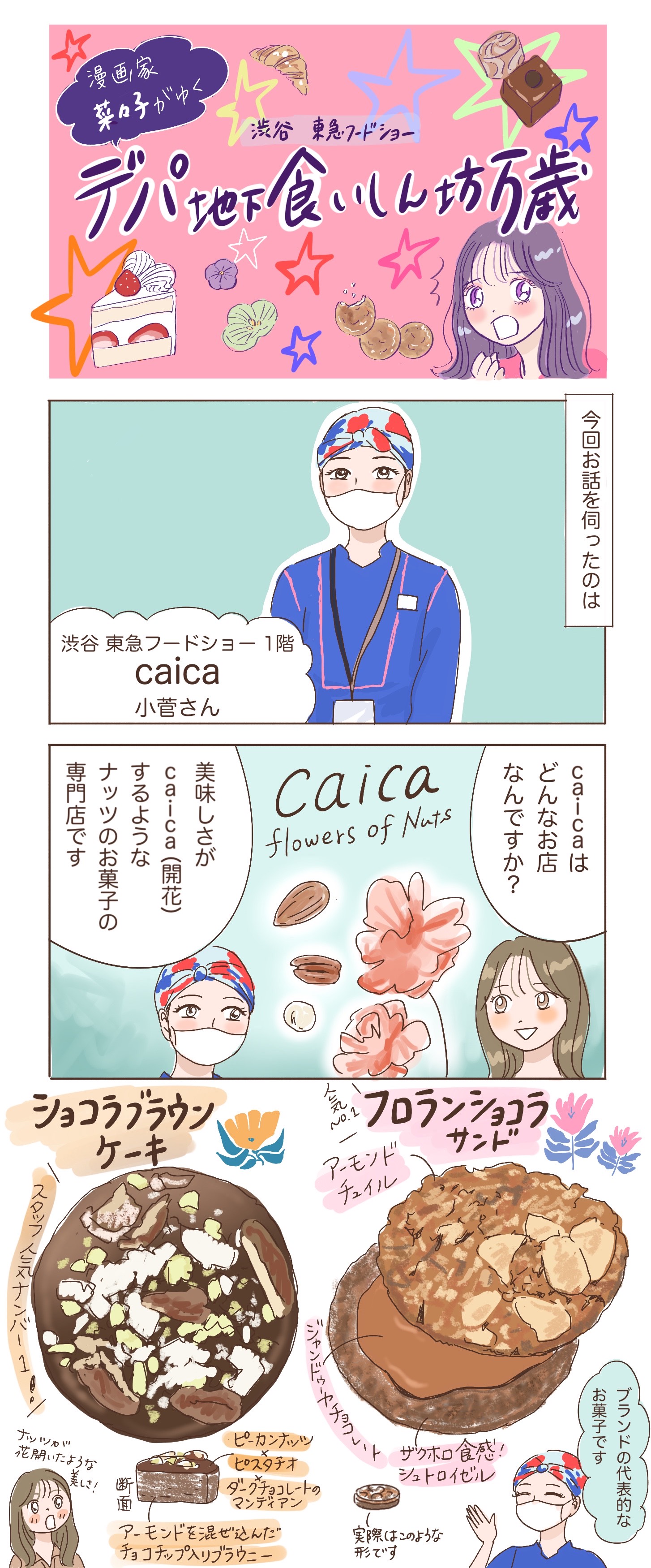 渋谷にはおいしいグルメがたくさん!歩くだけでも楽しいデパ地下から、漫画家・菜々子がおすすめのグルメの裏側をご紹介します。今回は渋谷 東急フードショー 渋谷マークシティ1階にある、口のなかで美味しさが“caica(開花)”するお菓子を楽しめる「caica」です。