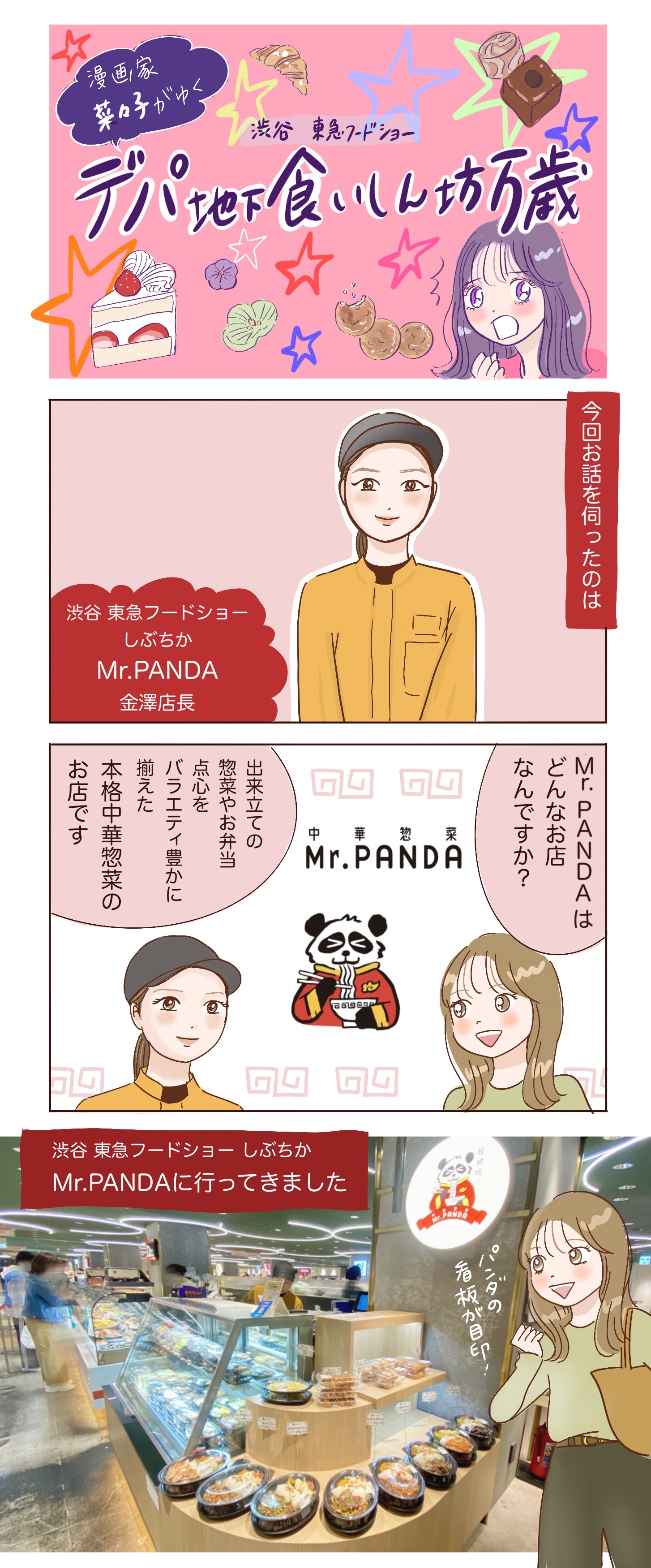 渋谷にはおいしいグルメがたくさん!歩くだけでも楽しいデパ地下から、漫画家・菜々子がおすすめのグルメの裏側をご紹介します。今回は渋谷 東急フードショー(しぶちか)にある、定番の中華料理からオリジナル料理まで、ライフスタイルにあった出来立て惣菜やお弁当、点心が楽しめる「Mr.PANDA(ミスターパンダ)」です。