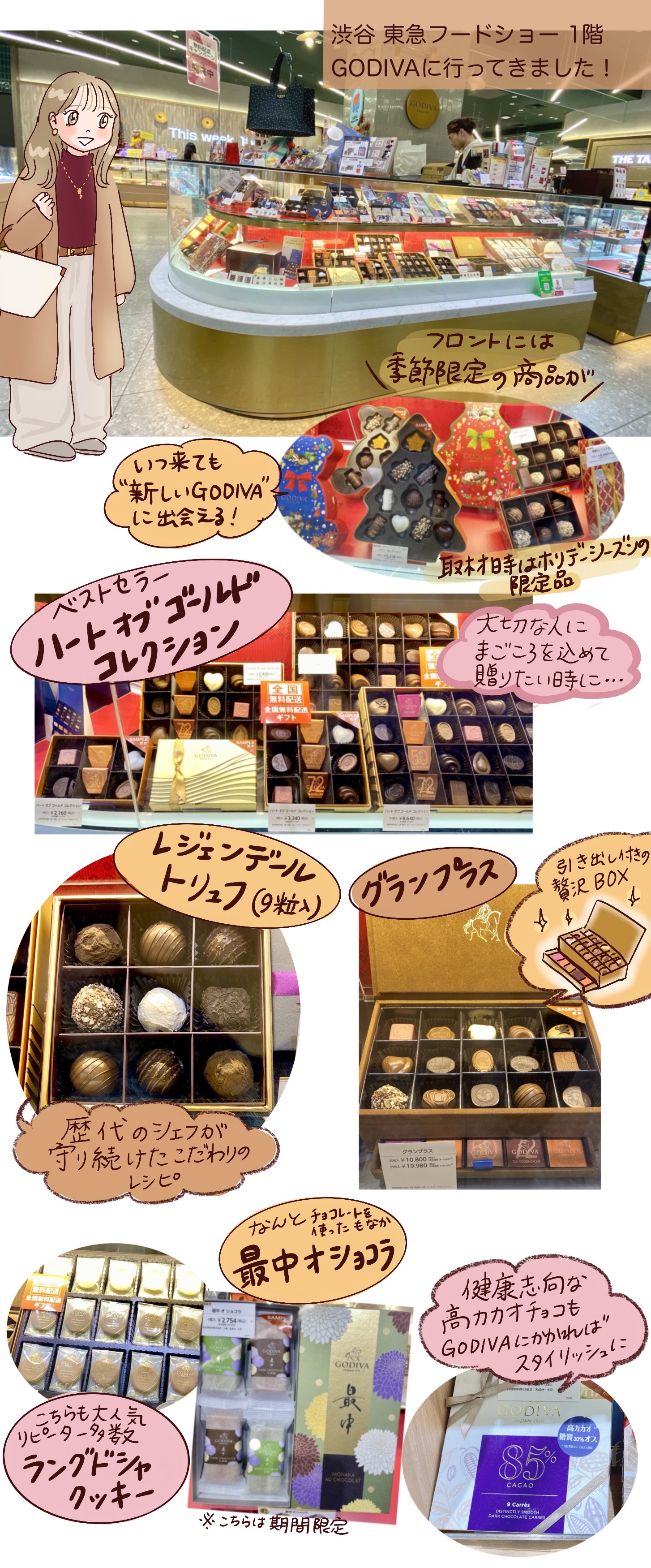渋谷にはおいしいグルメがたくさん!歩くだけでも楽しいデパ地下から、漫画家・菜々子がおすすめのグルメの裏側をご紹介します。今回は渋谷 東急フードショー 渋谷マークシティ1階にある、世界で愛されるプレミアムチョコレートのリーディングブランド〈GODIVA (ゴディバ)〉です。