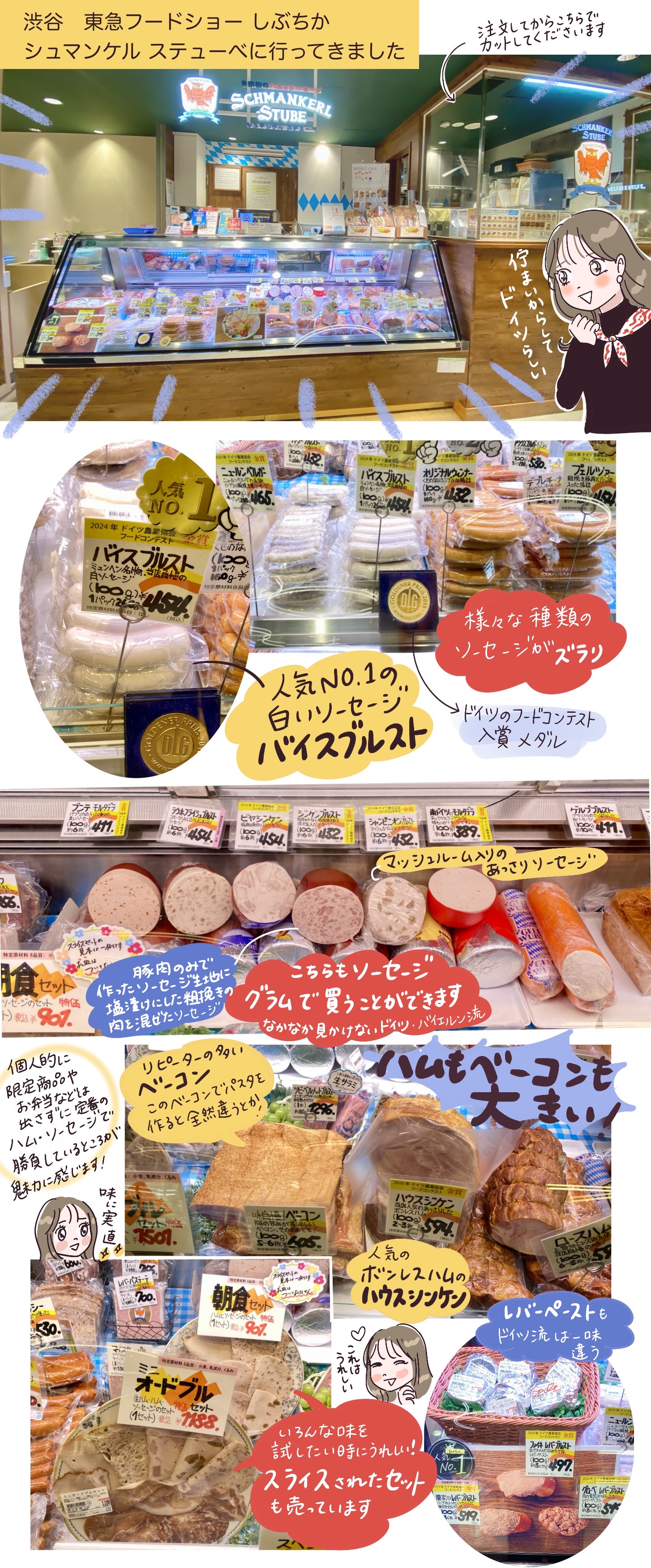 渋谷にはおいしいグルメがたくさん!歩くだけでも楽しいデパ地下から、漫画家・菜々子がおすすめのグルメの裏側をご紹介します。今回は渋谷 東急フードショー(しぶちか)にある、本場ドイツでの修行を経てマイスターの資格を取得した奥沢一郎氏が手掛ける本格ドイツハム・ソーセージの専門店〈シュマンケル ステューベ〉です。