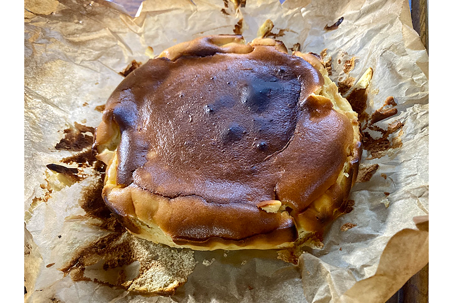 4. ケーキ型にくしゃくしゃに丸めてから水で濡らして水切りしたオーブンペーパーを敷き、3を流し入れる。