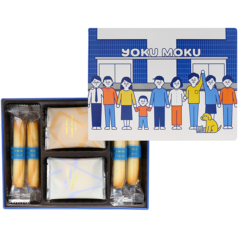 ヨックモック青山本店をモチーフにした建物の前で、人々が笑顔で繋がる様子を描いた「松本セイジ」描き下ろしの限定パッケージデザインです。