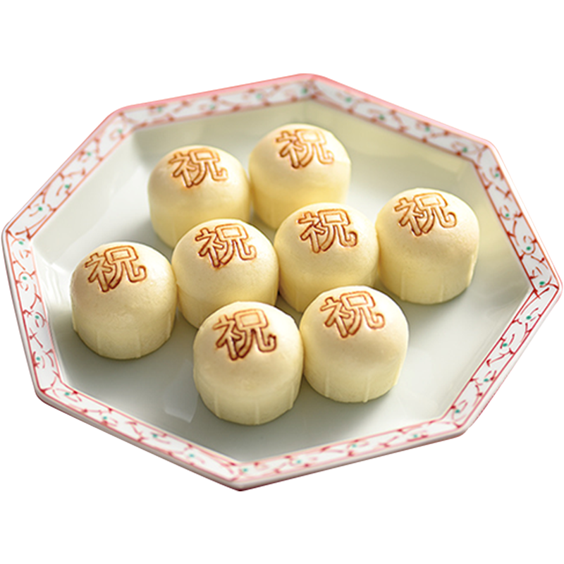 中華まんの皮の中にシウマイのあんが入った一口サイズのおまんじゅう。天面に゛祝”の焼き印が入った特別バージョンで、東急フードショー誕生25周年をお祝いいたします。